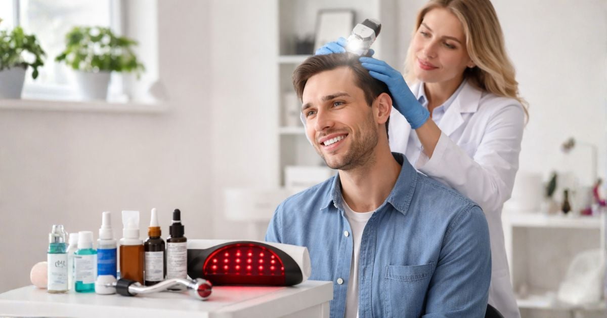 Low-level laser therapy has become a legitimate part of the conversation. This treatment uses red or near-infrared light to stimulate hair follicles, support blood circulation, and shift follicles toward the growth phase. It is non-surgical, painless, and suitable for daily activities immediately after each session [7][8].
