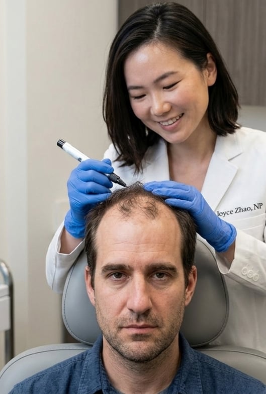 Joyce Zhao, NP-BC is a dermatology-trained Nurse Practitioner specializing in medical hair loss management, regenerative scalp therapies, and both surgical and non-surgical hair restoration. She provides thorough scalp evaluations, personalized treatment plans, and compassionate care to support patients throughout their hair restoration journey, focusing on natural results and long-term scalp health.